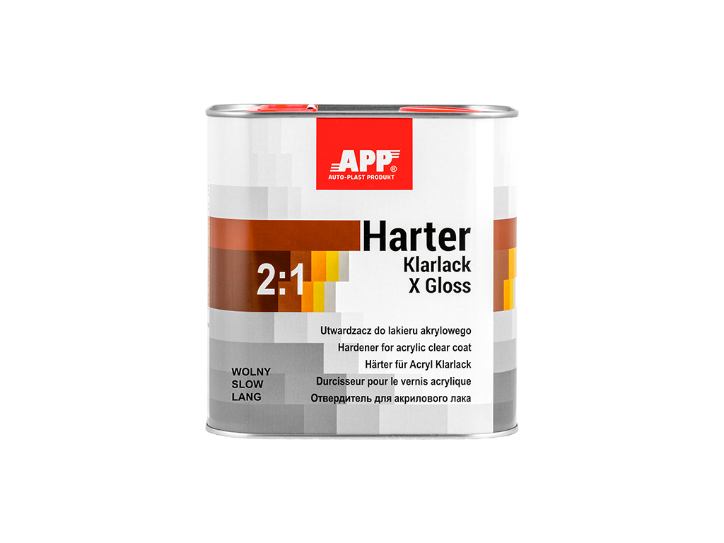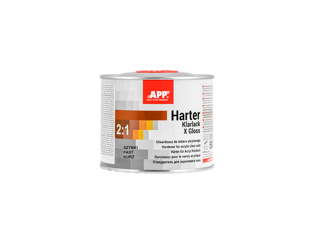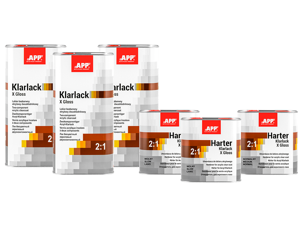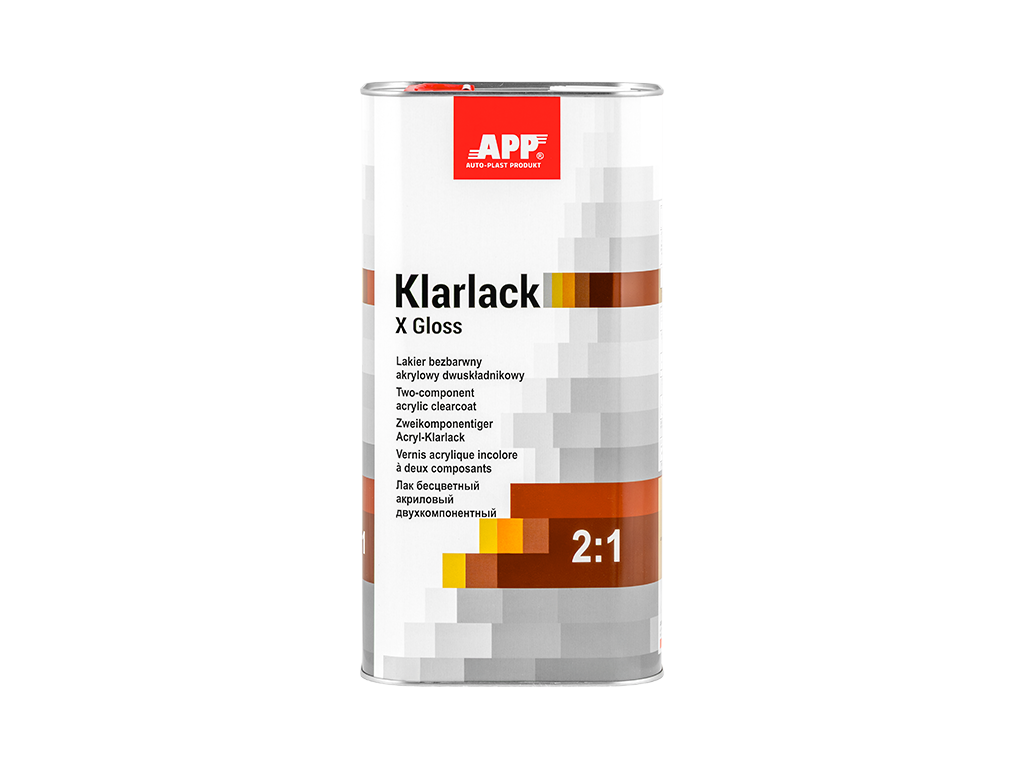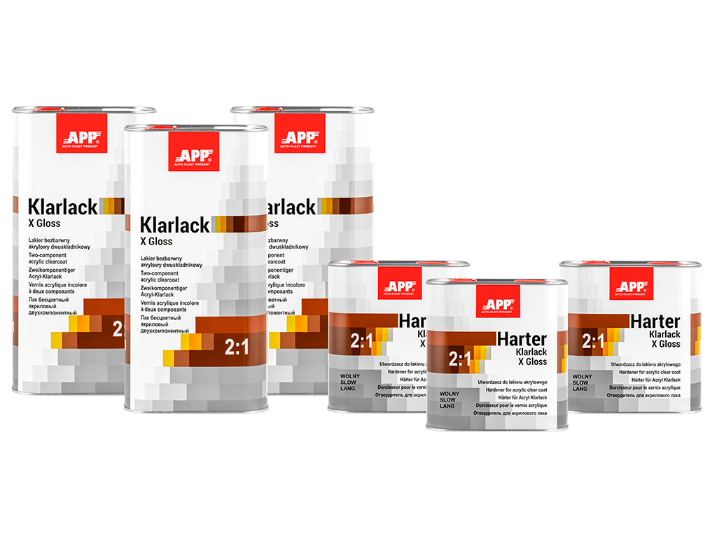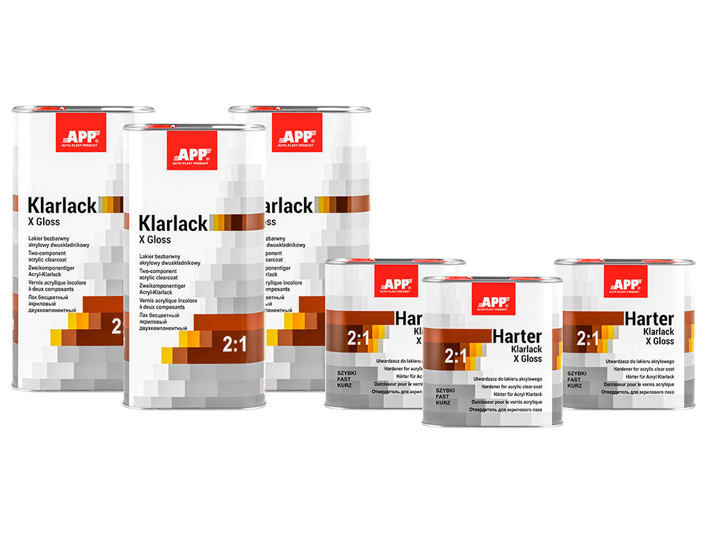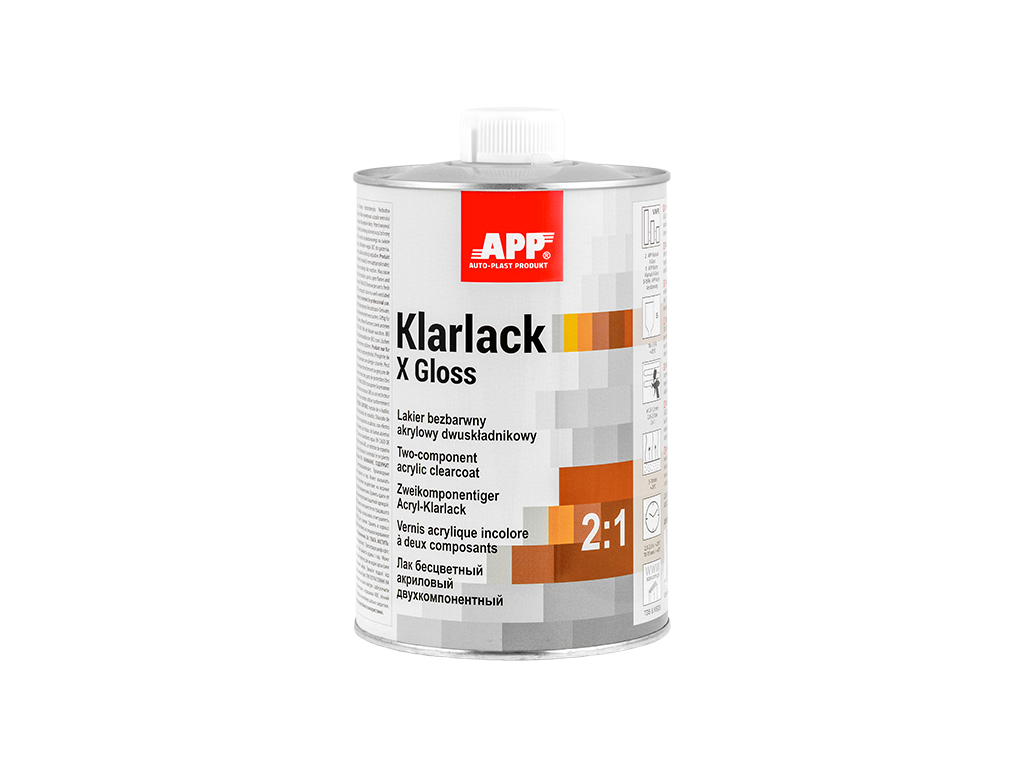APP Klarlack X Gloss 2:1 - Vernis acrylique bicomposant, à séchage rapide, incolore, de classe HS, caractérisé par une résistance accrue aux rayures et une brillance très élevée. Son temps de séchage court permet de l'utiliser pour réparer les dommages urbains courants, les éléments individuels et les ensembles d'éléments. Le vernis est facile à appliquer et à polir. Il offre un niveau de finition très élevé et, grâce à l'utilisation de filtres UV, il protège et prolonge la durée de vie de la couleur du vernis de base.