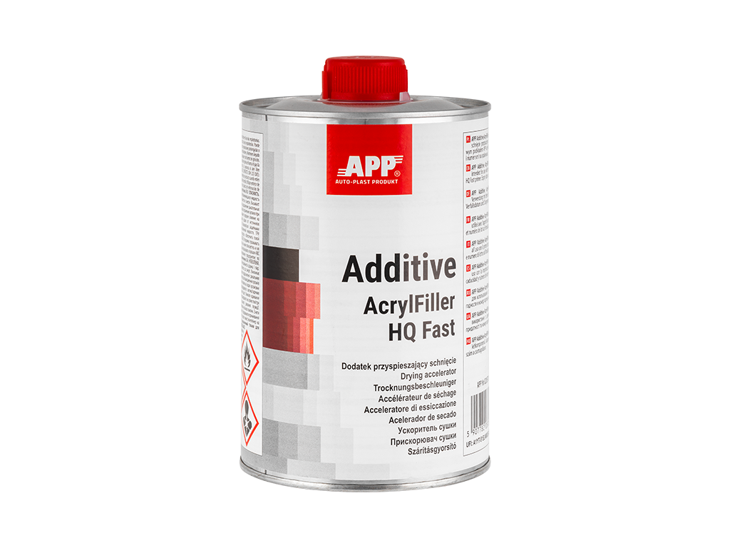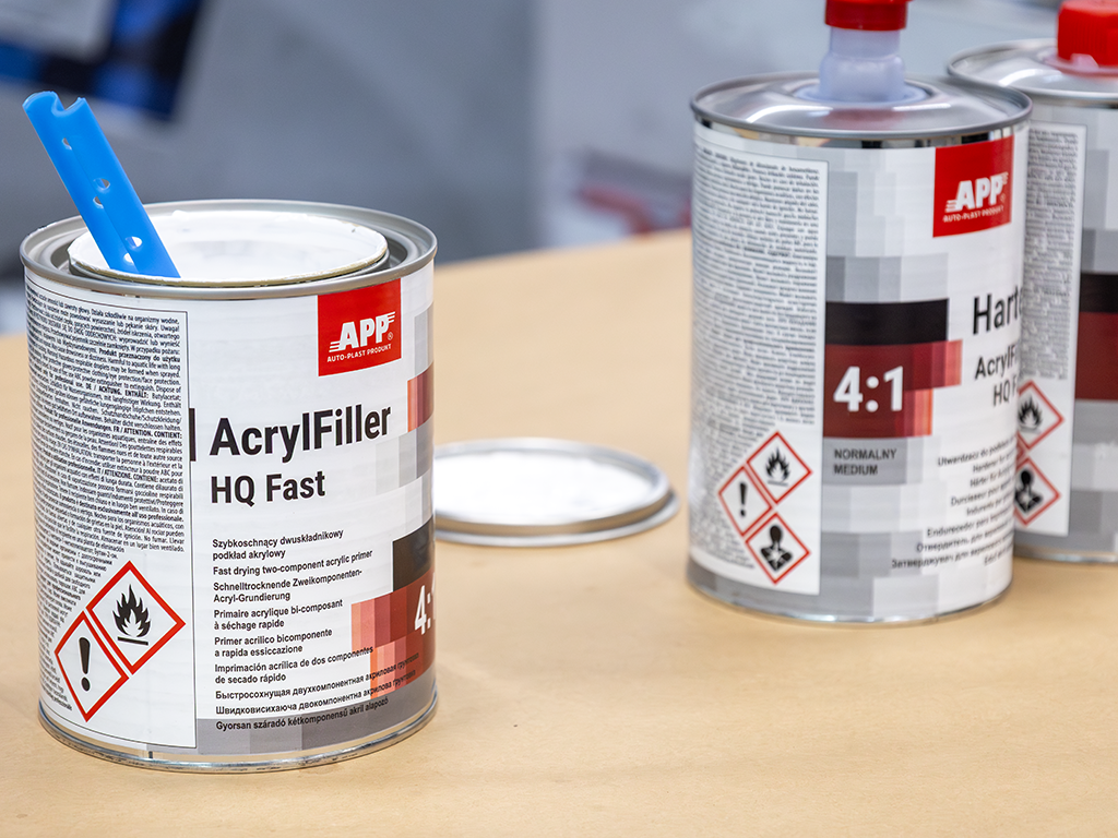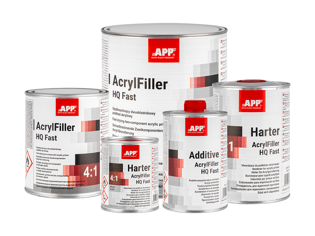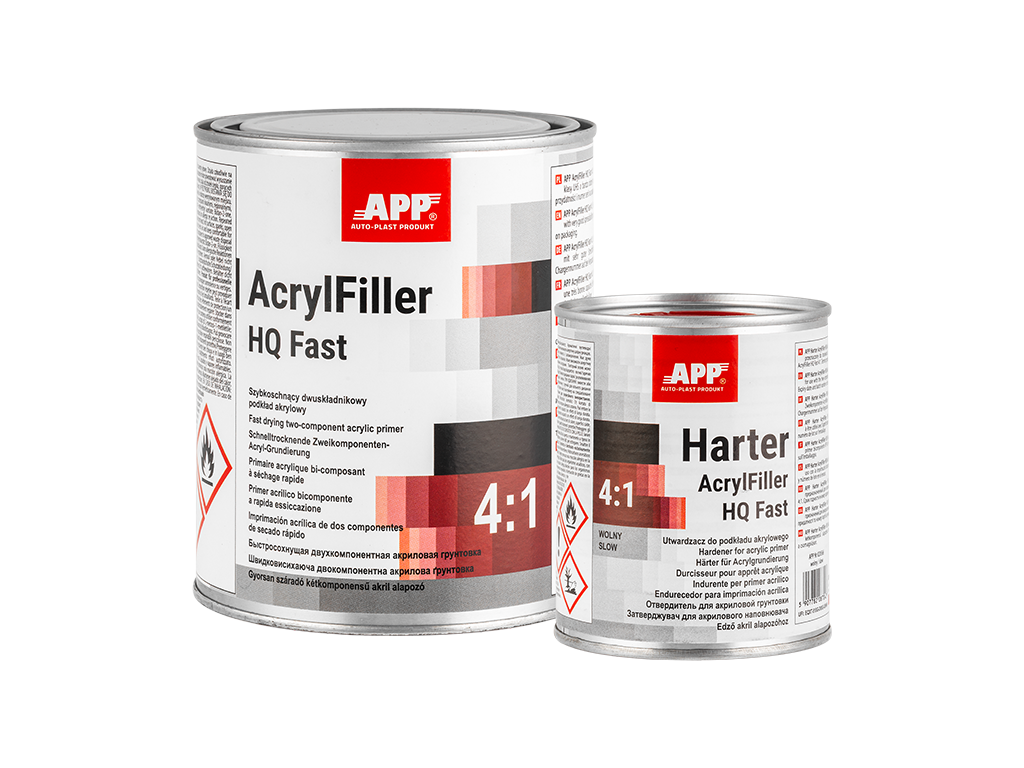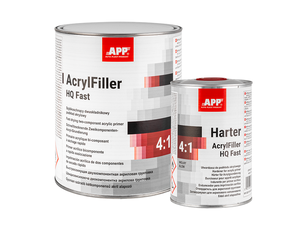 APP AcrylFiller HQ Fast - podkład akrylowy dwuskładnikowy klasy UHS o wysokiej zawartości cząstek stałych i krótkim czasie wiązania. Posiada doskonałą przyczepność do stali, szpachli poliestrowych i starych powłok lakierowych. Jest przeznaczony do stosowania jako podkład grubopowłokowy lub wypełniający. Posiada możliwość pracy w systemie mokro na mokro. Dostępny w trzech kolorach: szarym, czarnym i białym.
