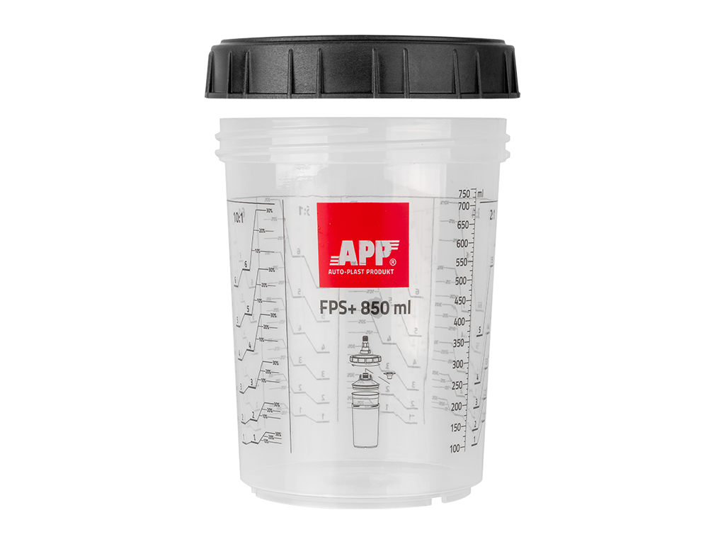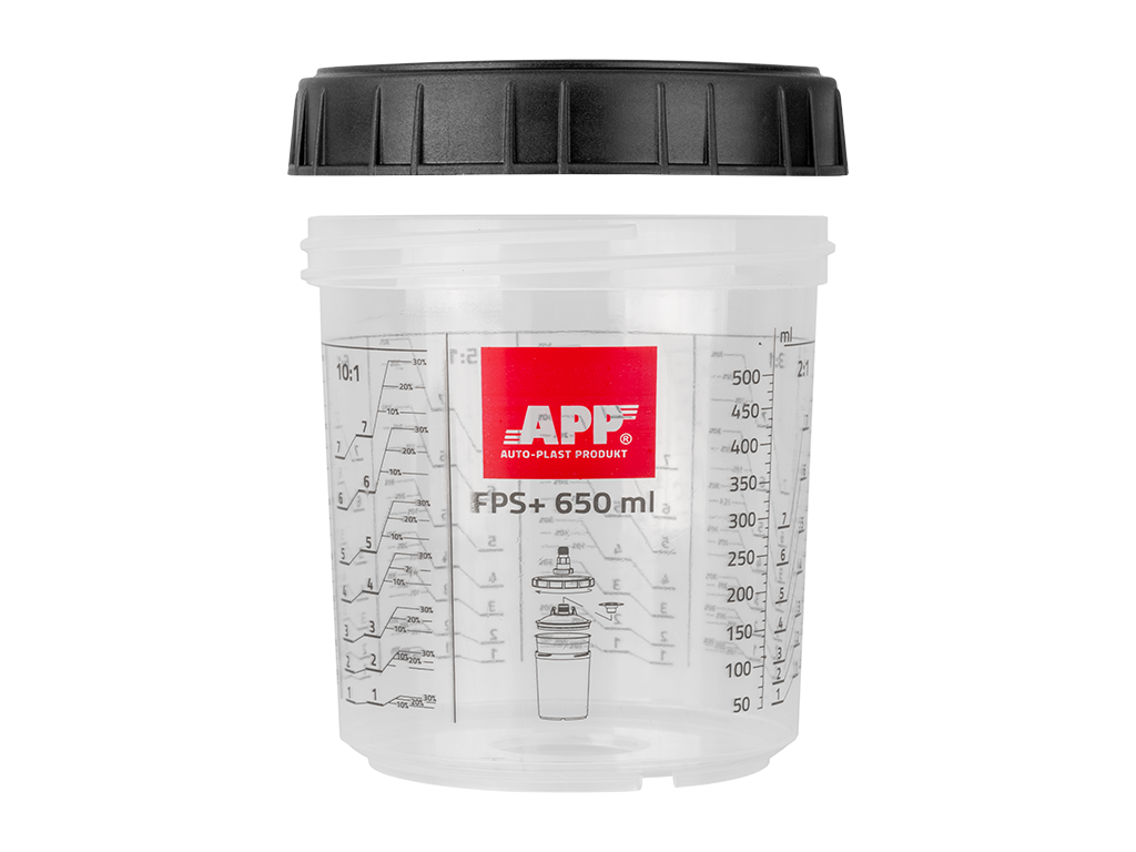 APP FPS Fast Preparation System to system jednorazowych kubków opadowych przeznaczonych do stosowania w pistoletach z górnym zbiornikiem oraz do mieszania farb i lakierów z utwardzaczami i rozcieńczalnikiem w różnych proporcjach. Wykonane z trwałego tworzywa odpornego na chemię stosowaną w lakierniach renowacyjnych i przemysłowych. Precyzyjne podziałki umożliwiają uzyskanie pożądanej ilości produktu gotowego do natrysku z zachowaniem właściwych proporcji mieszania. Zastosowanie wewnętrznego kubka miękkiego całkowicie izoluje lakier od otoczenia oraz umożliwia pracę w dowolnym położeniu lakierniczego pistoletu natryskowego.