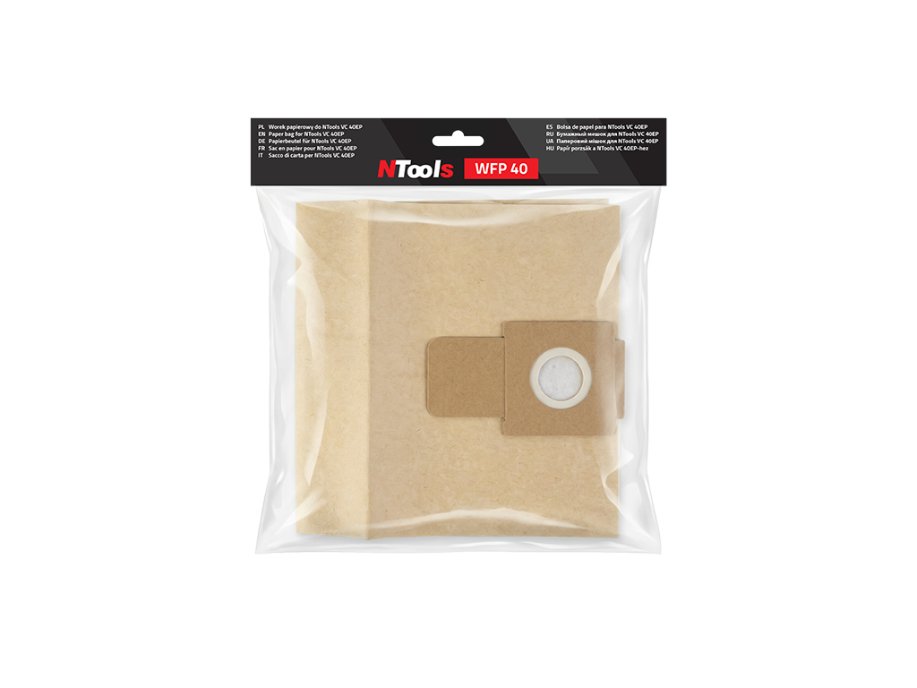 NTools WFP 40 to jednorazowy, papierowy worek na pył o pojemności 40 l do odsysacza NTools VC 40EP. Worek klejony, z dwuwarstwowego filtra celulozowego. Przeznaczony do pracy z pyłami suchymi.