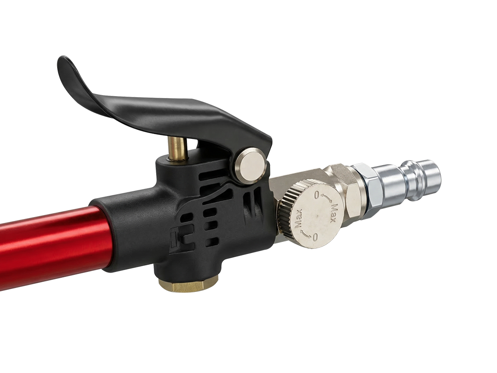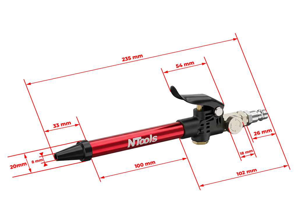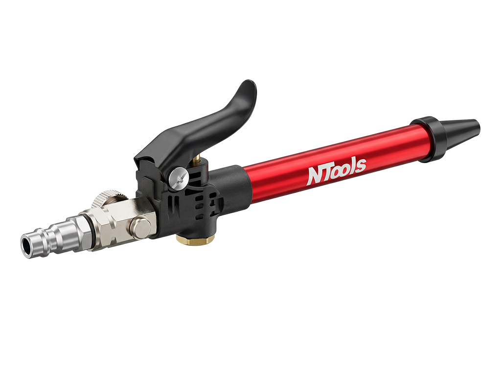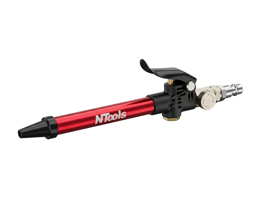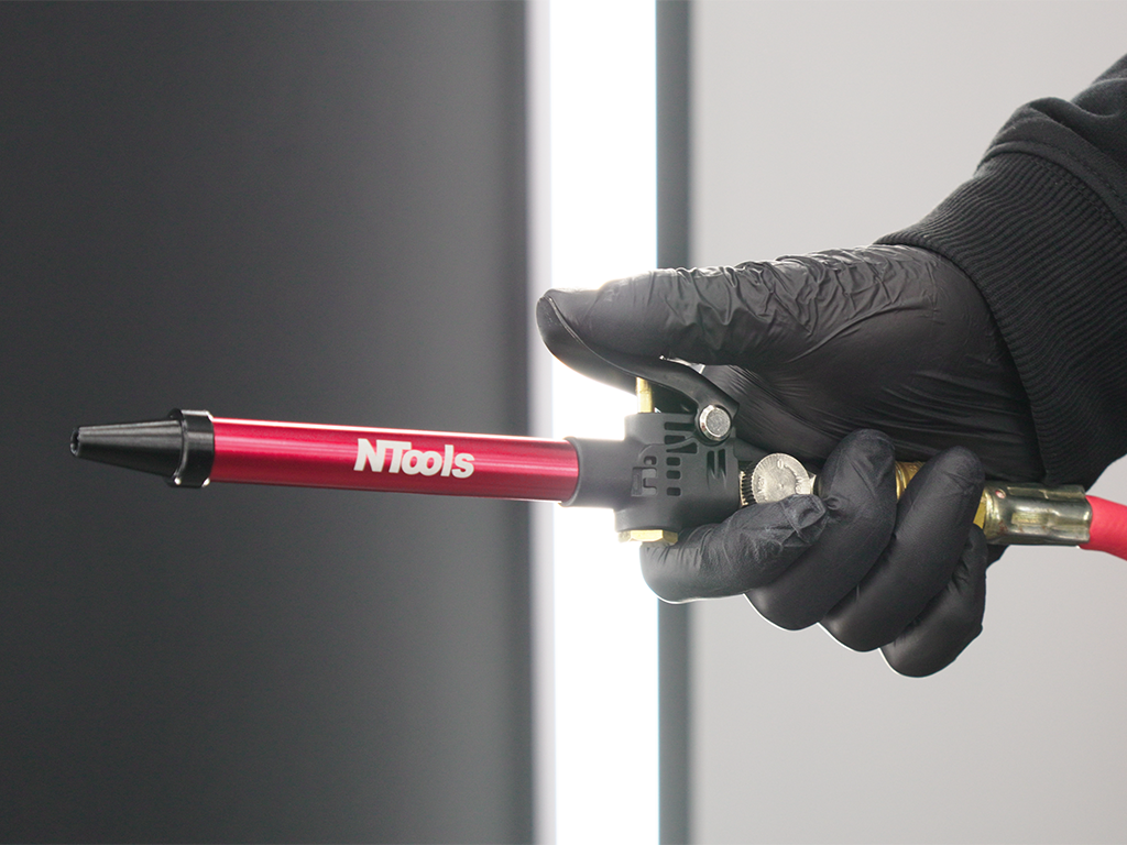 NTools AirTube - przyrząd do przedmuchiwania to narzędzie pneumatyczne przeznaczone do zastosowań w lakiernictwie i autodetailingu. Umożliwia szybkie i skuteczne usuwanie wody, kurzu, pyłu lakierniczego oraz innych zanieczyszczeń z powierzchni pojazdu i trudno dostępnych miejsc. Dzięki precyzyjnej dyszy zapewnia dokładną i efektywną pracę, zwiększając komfort użytkowania. Niezastąpiony podczas przygotowania elementów do lakierowania, suszenia oraz czyszczenia detali. Urządzenie doskonale sprawdza się również w czyszczeniu padów polerskich, skutecznie usuwając resztki past.
