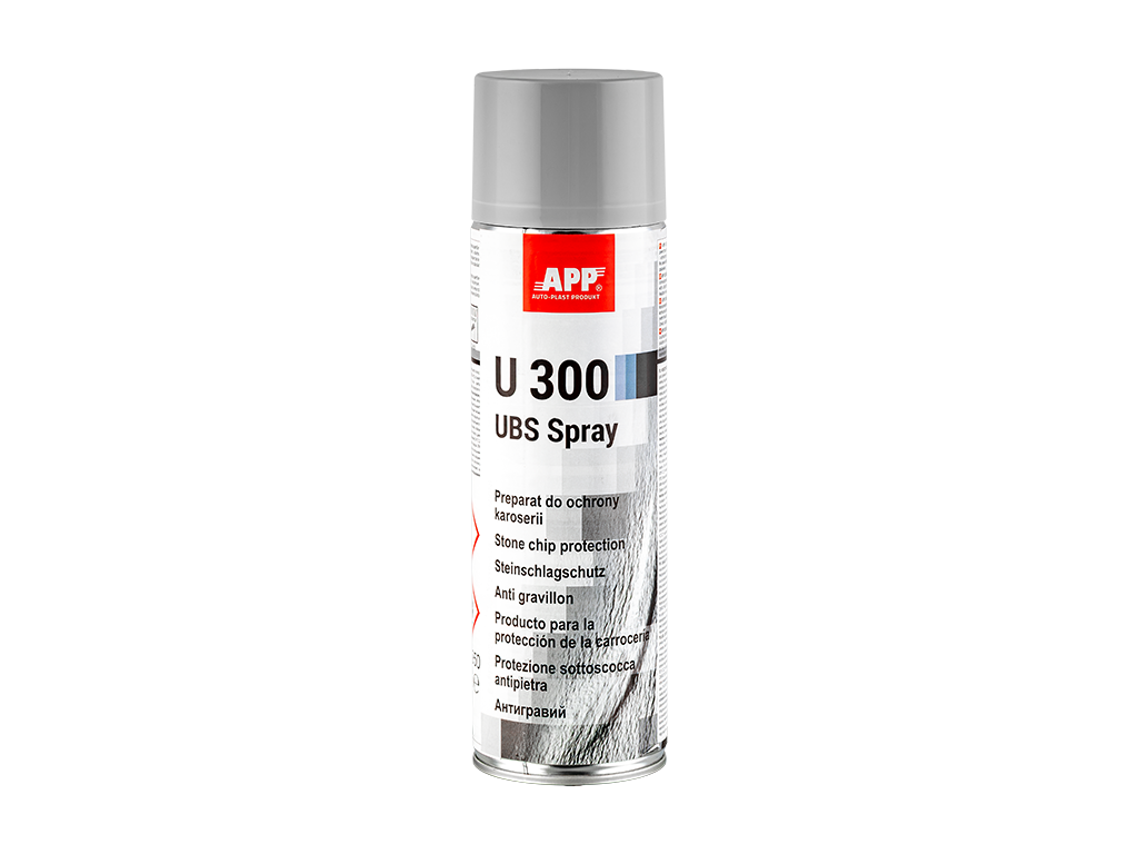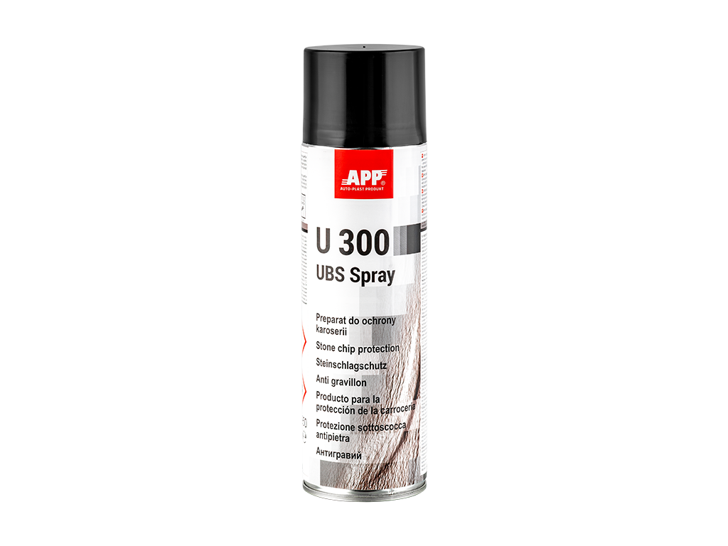 APP U300 UBS Spray to - это быстросохнущий, долговечный эластичный аэрозольный состав. Защищает поверхность кузова автомобиля от ударов камней и гравия. Обладает звукоизоляционными, изоляционными и антикоррозионными свойствами. Полученное покрытие с низким структурным эффектом может быть покрыто любым типом верхнего покрытия. Не содержит битума и асфальта.